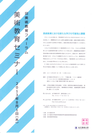 このような状況を踏まえつつ美術教育セミナーでは、これからの学校教育における美術教育の新たな学びについて考えます。課題探究型の授業や言語活動の充実を図る授業研究が進められる中で、図画工作・美術科の学習活動では今、どのような実践がなされているのでしょうか。美術教育の特質を生かしたアプローチの方法と同時に、「美術教育における学びとは何か」その本質が問われていると考えます。 21世紀に生きる子どもをはぐくむこれからの美術教育における新たな学びの可能性と課題について皆様と共に考えたいと思います。 主催:女子美術大学