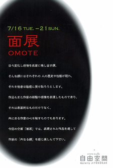 そんな顔にはそれぞれの、人の歴史や性格が現れ、 それを敏感に受け取ろうとします。 作品もまた作家の経験や、感情を表現した物であり。 それは表面的な物だけではなく、 内にある作家の心を映すものでもあります。 今回の企画「 面展 」では、表現された作品を通じて、 作家の「 内なる顔 」を感じ楽しんで下さい。 2013年7月16日(火)~ 2013年7月21日(日)