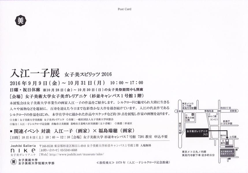 ———————————————————————————————————- 【オープニングレセプション】 大村智名誉理事長・入江一子先生をお迎えしてのオープニングレセプション 2016 年 9 月 9 日(金)14:00-15:30(受付開始は 13:30 より) 会 場 女子美術大学 杉並キャンパス 学生食堂(2号館1階) 〒166-8538 東京都杉並区和田1-49-8 電話03-5340-4500(代)