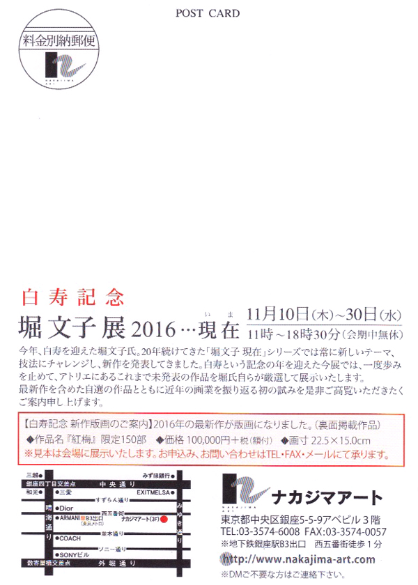 今年、白寿を迎えた堀文子氏。20年続けてきた「堀文子 現在」シリーズでは常に新しいテーマ、技法にチャレンジし、新作を発表してきました。白寿という記念の年を迎えた今展では、一度歩みを止めて、アトリエにあるこれまで未発表の作品を堀氏自らが厳選して展示いたします。 最新作を含めた自選の作品とともに近年の画業を振り返る初の試みを是非ご高覧いただきたくご案内申し上げます。(DMより)