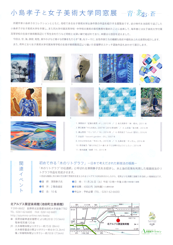 ○関連イベント 初めて作る「木のリトグラフ」ー日本で考えだされた新技法の版画ー 2016年11月26日(土) 10:00ー16:00 ※昼休憩1時間 講師 澤岡泰子氏 参加費 4,000円 予約はお電話にて(TEL:0261-62-6600)