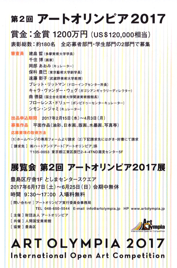 *応募要項や出品料について、詳細はオフィシャルウェブサイトをご覧ください。 アートオリンピア2017オフィシャルウェブサイトはこちら
