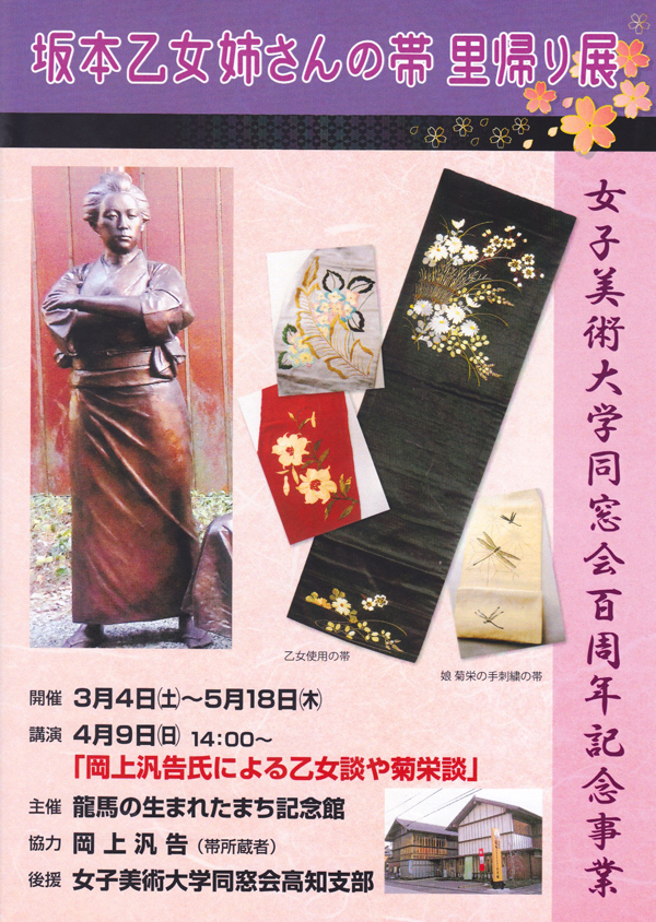 主催 龍馬の生まれたまち記念館 協力 岡上汎告氏(帯所有者) 後援 女子美術大学同窓会高知支部