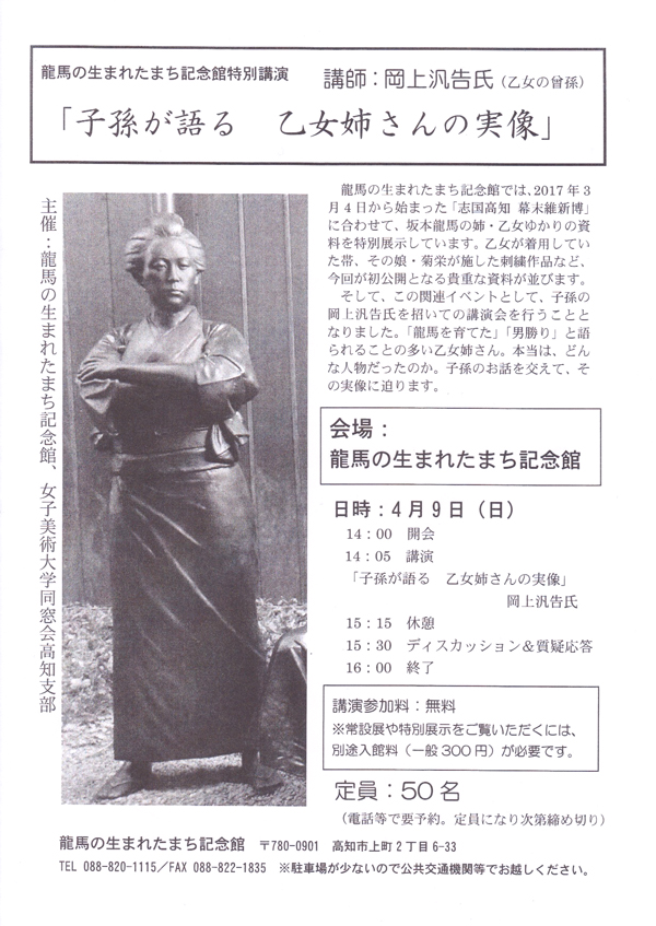 ○特別講演 「子孫が語る 乙女姉さんの実像」 講師:岡上汎告氏 日時:4月9日(日)14:00-16:00 *3/13満席となりました。