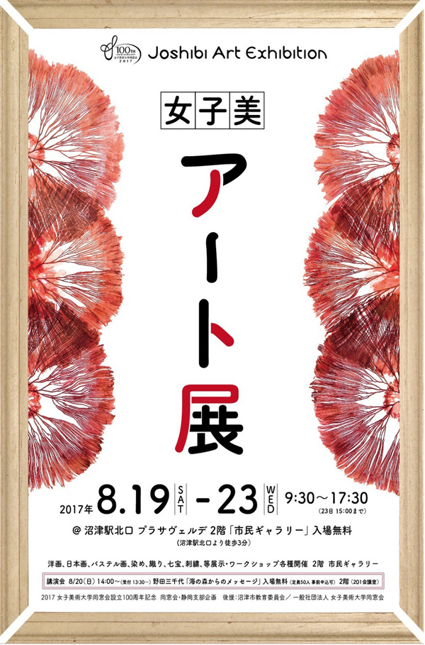 女子美術大学同窓会設立100周年を記念し、同窓会・静岡支部のメンバーによる様々な分野の作品の展示を行います。 また、20日(日)には海と地球環境啓発活動を全国で展開中の女子美同窓生・野田三千代さんの講演会も開催いたします。 出品者によるワークショップも開催いたしますので、ぜひお気軽にご参加ください。