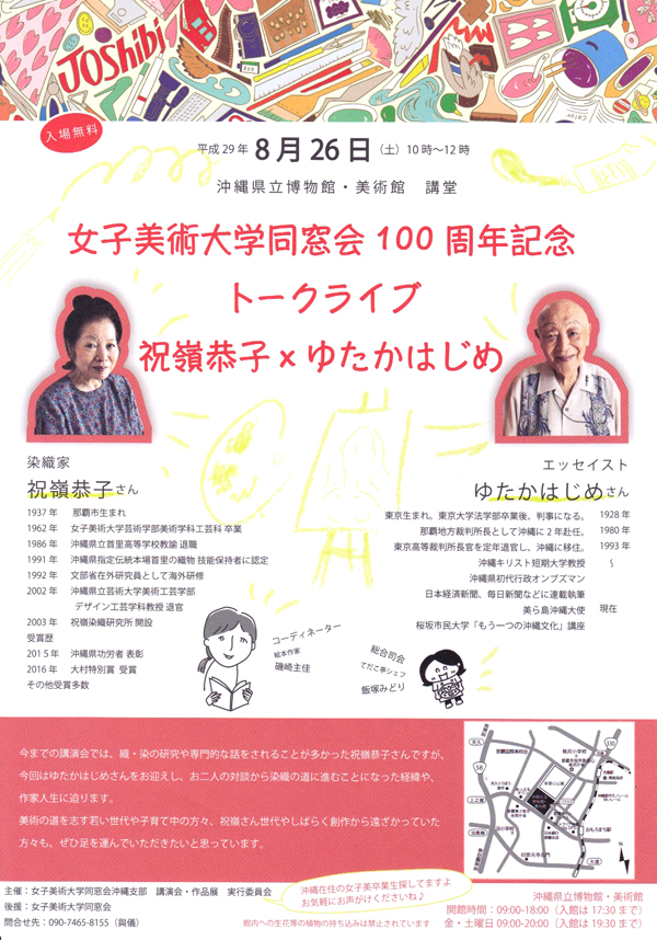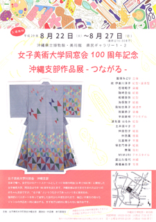 女子美術大学同窓会設立100周年記念 沖縄支部作品展 ーつながるー 飯塚みどり 故 伊差川洋子 石垣昭子 磯崎主佳 板橋亜弥 海保敦子 我如古真子 祝嶺恭子 平良政枝 渡名喜はるみ 土井菜々子 仲座包子 仲西薫 比嘉陽子 保志門幸子 舞陽 MIMURI 屋比久佳代 與儀美奈子 トークライブ 祝嶺恭子×ゆたかはじめ