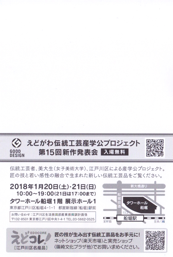 伝統工芸者、美大生(女子美術大学)、江戸川区による産学公プロジェクトです。 匠の技と若い感性の融合で生まれた新しい伝統工芸品が展示されます。