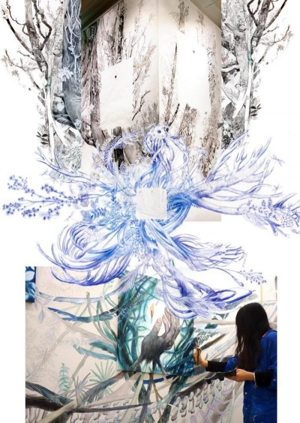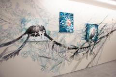 一つの絵画から、複数のイメージが成長し、増殖し続ける絵画を「はみ出し壁画」と呼びます。公開制作では、人間たちが眠りについた時間、巨大な植物が爆発的に覚醒し、繁茂する様を綴ります。たとえ人類が消滅しても、力強く成長し続ける生命の営みが、画家の手わざによって部屋いっぱいに広がることでしょう。私たちを産み出す母なる大地の物語です。