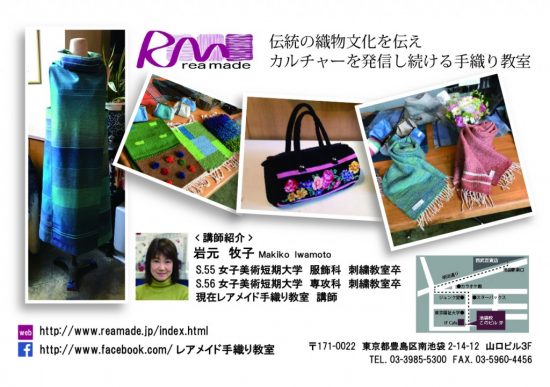 岩元牧子さんがレアメイド手織り教室で講師をされています。 レアメイド手織り教室は織技法から織工程全般、作品作りをサポートする手織教室です。