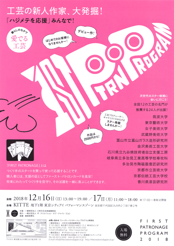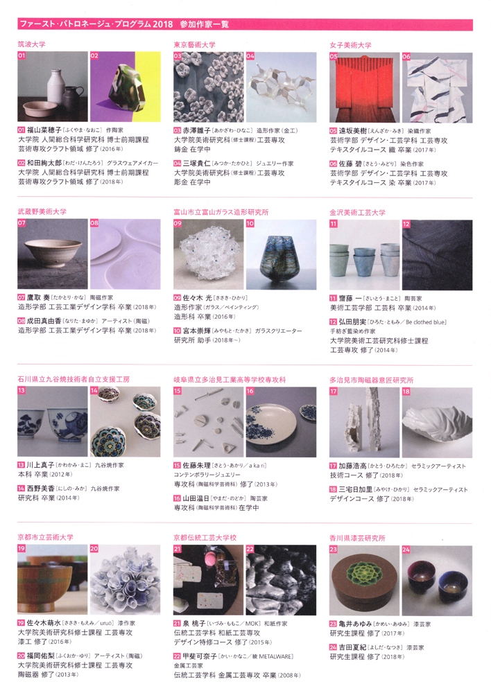 参加機関:筑波大学/東京藝術大学/女子美術大学/武蔵野美術大学/富山市立富山ガラス造形研究所/ 金沢美術工芸大学/石川県立九谷焼技術者自立支援工房/岐阜県立多治見工業高等学校専攻科/多治見市陶磁器意匠研究所/京都市立芸術大学/京都伝統工芸大学校/香川県漆芸研究所