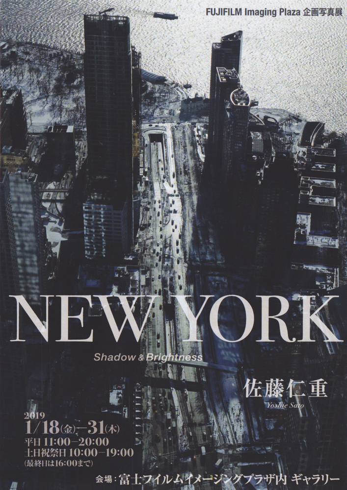 佐藤仁重写真展「NEW YORK ~Shadow & Brightness~」 会期:2019年1月18日(金)~1月31日(木) 時間:平日11:00-20:00、土日祝日10:00-19:00(最終日は16:00まで) 会場:FUJIFILM Imaging plaza Gallery 〒100-0005 東京都千代田区丸の内2-1-1 丸の内 MY PLAZA 3階 TEL.03-6259-1615 ▶FUJIFILM Imaging plaza Gallery【展覧会詳細】 |ギャラリートーク 日時:2019年1月27日(日)14:00〜 富士フイルムイメージングプラザ(丸の内)で企画展として個展を開催。新しい富士フイルム製のミラーレス一眼カメラでニューヨークを撮影。是非ご覧ください。 |