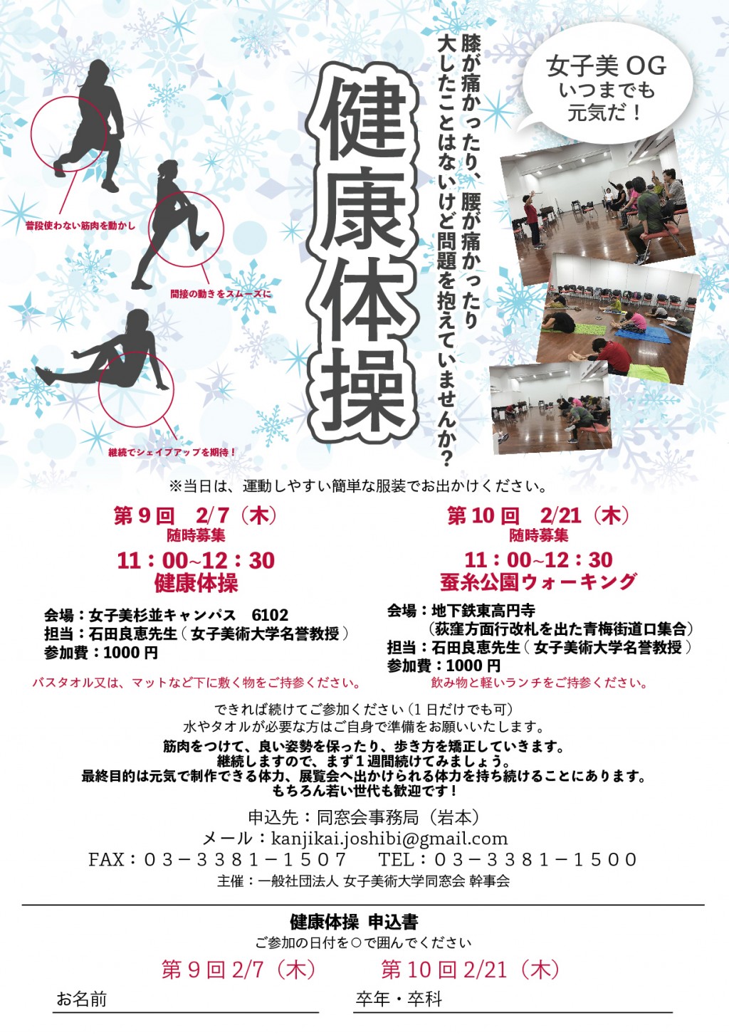 第9回 2月7日(木)11:00-12:30 健康体操 女子美術大学杉並キャンパス 6号館6102講義室 〒166-8538 東京都杉並区和田1-49-8 ◎バスタオル又は、マットなど下に敷く物をご持参ください。