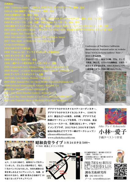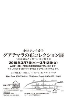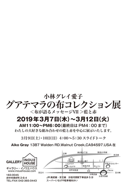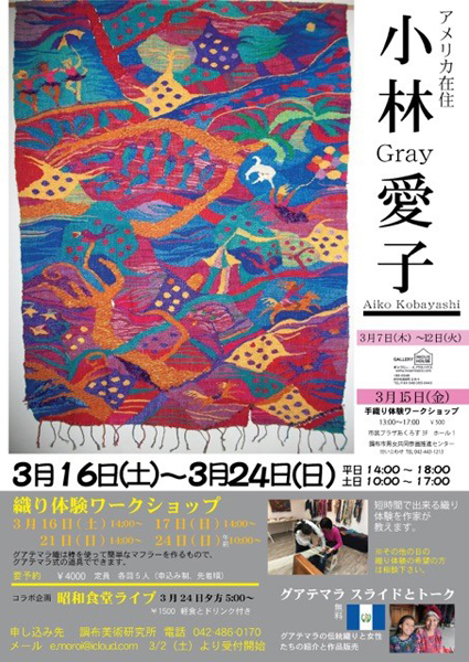 小林グレイ愛子 グアテマラの布コレクション展 〈布が語るメッセージⅦ〉藍と赤 会期:2019年3月7日(木)〜3月12日(火) 時間:11:00-18:00(最終日は16:00まで) 会場:ギャラリー・イノウエハウス 〒183-0045 東京都府中市美好町2-6-4 TEL.042-365-0443 ■スライドトーク 日時:2019年3月9日(土)・10日(日)16:00-17:30 手織り体験ワークショップ 日時:2019年3月15日(金)13:00-17:00 会場:調布市民プラザあくろす 3F ホール1 〒182-0022 東京都調布市国領町2-5-15 コクティー3階 調布市男女共同参画推進センター 参加費:500円 《問い合わせ》 織り体験ワークショップ 日時 ①2019年3月16日(土)14:00〜 ②2019年3月17日(日)14:00〜 ③2019年3月21日(木)14:00〜 ④2019年3月24日(日)10:00〜 参加費:4,000円 定員:各回 5人(申込制・先着順) 《申込先》 ▶調布美術研究所 *3月2日(土)より受付開始 コラボ企画 昭和食堂ライブ 日時:2019年3月24日(日)17:00〜 参加費:1,500円(軽食とドリンク付き) ▶Aiko Kobayashi Fiber Art & 'Textile Tours' to Guatemala |