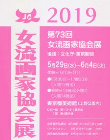 第73回 女流画家協会展 会期:2019年5月29日(水)〜6月4日(火) *6月3日(月)休館 時間:9:30-17:30(入場は閉会30分前まで) *最終日は14:30まで 会場:東京都美術館 ロビー階 第1,2,3,4展示室/1階 第4展示室 〒110-0007 東京都台東区上野公園8-36 TEL 03-3823-6921(代表) |