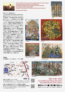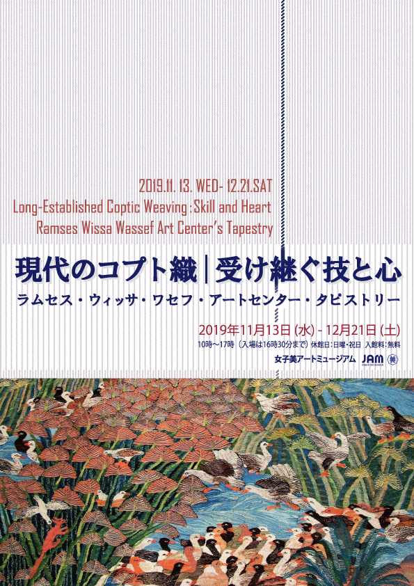 現代のコプト | 受け継がれる技と心 “Long Established Coptic Weaving : Skill and Heart” 展を11月13日から12月21日までJAMロビーにて開催します。エジプトのギザにある、ラムセス・ウィッサ・ワセフ・アートセンターの作家達が、日常の情景を自由に楽しく、多彩な色糸で綴ったタペストリー6点を展示いたします。