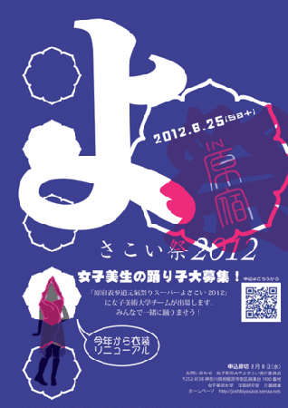 スーパーよさこい 2012 女子美よさこいチーム 踊り子募集! 昨年に引き続き、今年も「原宿表参道元氣祭 スーパーよさこい」に出場します。つきましては、女子美術大学の在校生・同窓生・教職員の皆様から広く踊り子を募集いたします。女子美術大学付属中高生も大歓迎!
