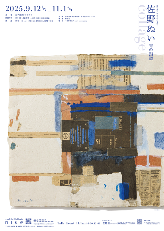 1955年に本学芸術学部洋画科を卒業した画家、佐野ぬいの作品展。本学卒業後は洋画科の助手や専任講師、助教授、教授として長年にわたり後進の指導にあたり、2007年には本学学長に就任。特徴的な青を基調とする抽象表現から「青の画家」と呼ばれ、佐野が描き出す色調のコンビネーションは、唯一無二の旋律を奏で、私たちを魅了します。 洋画家として知られている佐野ぬいは、コラージュ技法を用いた作品も数多く制作していました。色面の中にコラージュ素材のディテールが層を成すことにより、詩情あふれる佇まいの中に軽やかなリズムを響かせます。本展では佐野ぬいが表現するコラージュ作品を中心に、生涯にわたり描き続けた「青」の作品群をご紹介します。