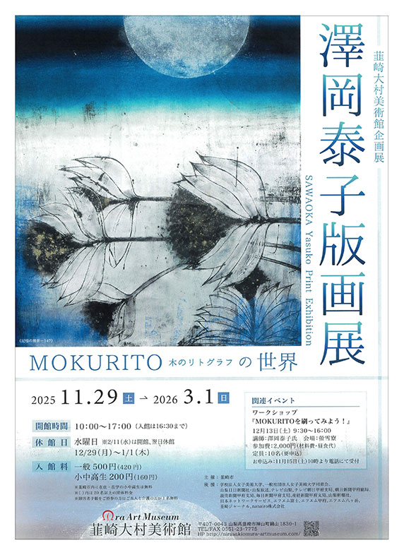 〇会期2025年11月29日(土)〜2026年3月1日(日) ※休館日:水曜日(2/11(水)は開館、翌日休館)、12/29(月)〜1/1(木)◯開館時間10:00〜17:00 ※入館は16:30まで◯入館料一般:500円小中高生:200円〇会場韮崎大村美術館〒407-0043 山梨県韮崎市神山町鍋山1830-1TEL/FAX:0551-23-7775関連イベントについてはHPをご覧ください。