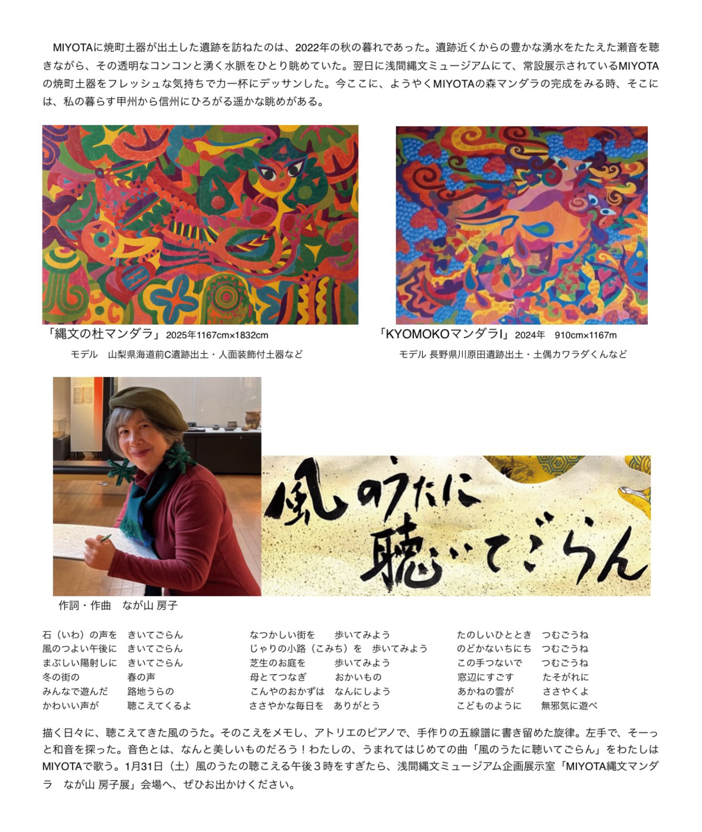 長和町、MIYOTA、この地に花咲いた縄文曼陀羅を描く日々に、風の詩とメロディー「風のうたに聴いてごらん」は産まれました。MIYOTAの自然空間に暮らし、音と協同(コラボレイト)した作曲家武満徹氏の没後30年に寄せて、なが山房子のうたう縄文曼陀羅の世界をどうぞお楽しみください。