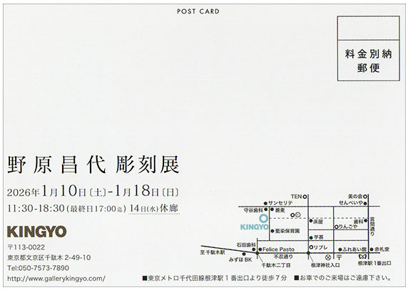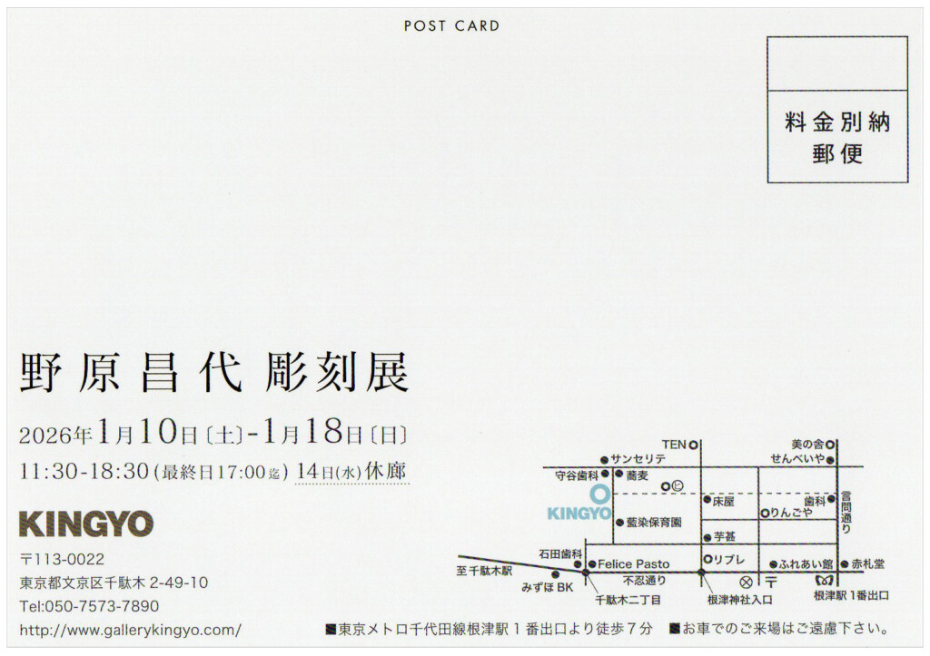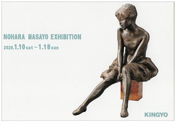 野原昌代 1974年 専攻科造形専攻(彫塑)卒◯会期2026年1月10日(土)~1月18日(日) ※14日(水)は休廊◯時間11:30~18:30 ※最終日は17:00まで◯会場KINGYO〒113-0022 東京都文京区千駄木2-49-10TEL:050-7573-7890アクセス:地下鉄千代田線 根津駅・千駄木駅 両駅から徒歩7分
