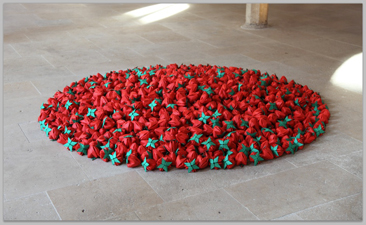 この苺のインスタレーション〈あるひとつの祈り〉は、東日本大震災後の2011年5月、イギリスのデザイン事務所から、東日本大震災の被災者のためのオマージュ作品を依頼され制作したものです。苺は漢字で”草冠”に”母”と書きます。紙の苺は、ちょうど私の心臓の大きさにあたり、私にとっては命の象徴でもあります。2011年7月、パリの13世紀の僧院建築Collège des Bernardinsで、このはじめて苺のインスタレーションを行った際、私は明け方からセットアップをしていましたので、13世紀の人も同じように踏みしめたであろうこの僧院の床の上を、同じように裸足で歩きながら設置作業をしていました。作業の途中で、床に寝そべって頬を床につけると、いくつものちいさな貝の化石の跡が古い象牙色の床に窪んで見えました。長い長い時間を経た僧院の床の上に、軽い素材の紙の苺が幾層にも重なっているので、その紙と石との物質感のコントラストと、足の裏のひんやりとした冷たさが体にしみこみ、私自身の命のはかなさが、余計に無常に思い知らされるようでした。でも私はこの紙の苺に、生命の増殖力や、母性の力、再生の力などの思いを込めたいと思っています。私達の生は、この広大な宇宙に比べると、一瞬で駆け抜けていくようなつかの間のものです。でもたとえそのことをいやと言う程知っていたとしても、それぞれの持ち場でこの一瞬一瞬を生きて行かなければならないのですし、それぞれに用意された時間をまっとうしなければならないのだと思っています。