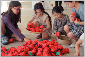 このパリの僧院建築では、苺のインスタレーションの後、私は短いスピーチをし、そこに集まってくれた方々と共に黙祷をしました。私自身は、カトリック信者ではないのですが、この時は職業年齢も様々、またそれぞれの方の宗教も、仏教、神道、カトリック、プロテスタント、ユダヤ教など、様々な宗教の方達がいらしていましたが、皆一緒に苺のインスタレーションを囲んで、東日本大震災で亡くなった方々へ黙祷をしました。その後それらの赤い紙の苺達は、黙祷に参加してくれていた子供たちが、みなで籠を手に大切に運搬用の箱に片付けてくれたのですが、彼ら彼女らのきびきびとした動きと、普段よりも内省的な瞳がとても心に残っています。 野口香子 |