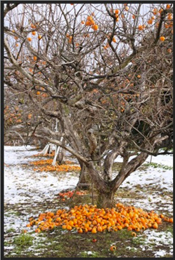 | ポーラ美術館での苺のインスタレーション展示に足を運んでくださった、福島の小学校(全校生徒24人)の校長先生が送ってくださった写真。こちらの校長先生撮影。収穫できない柿たち。木の表皮は除染のために、削りとられている。 |